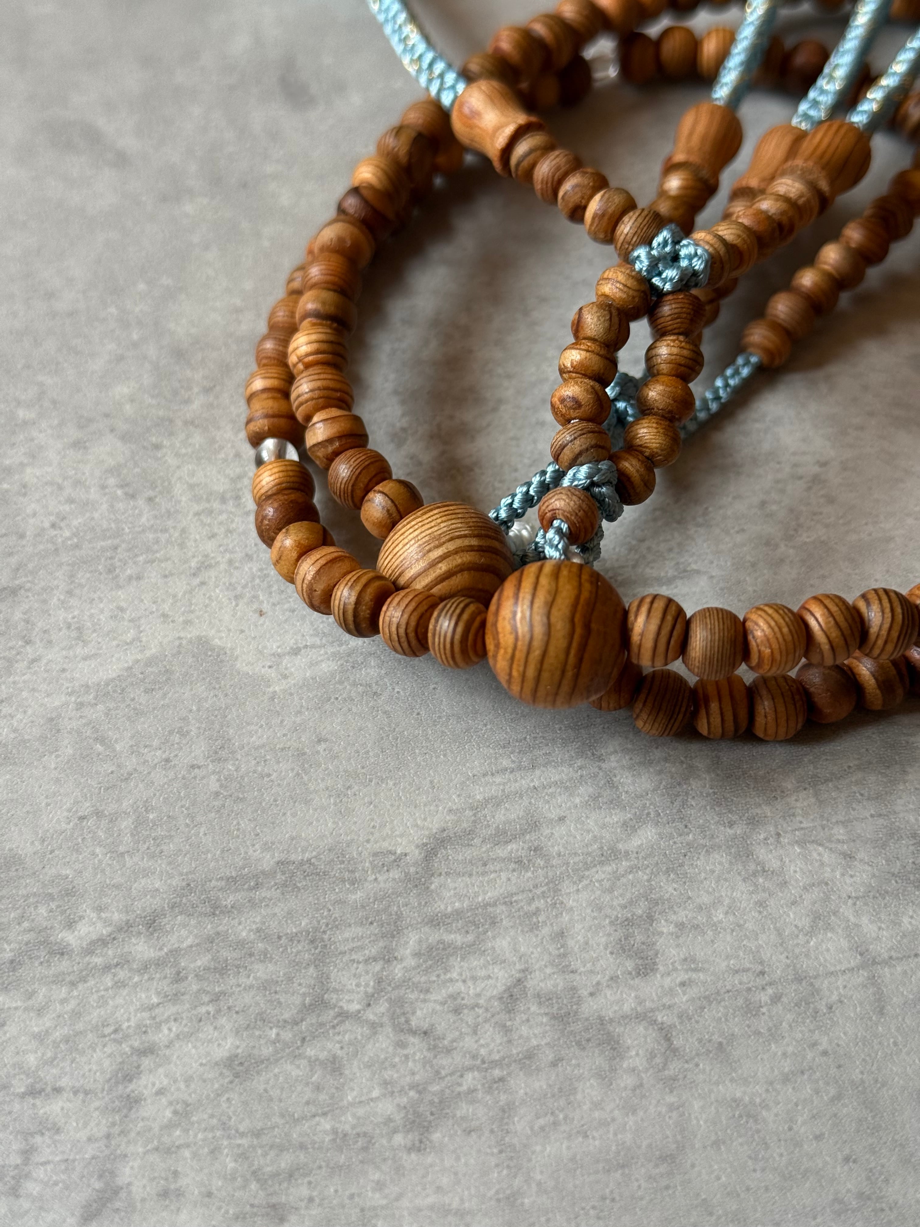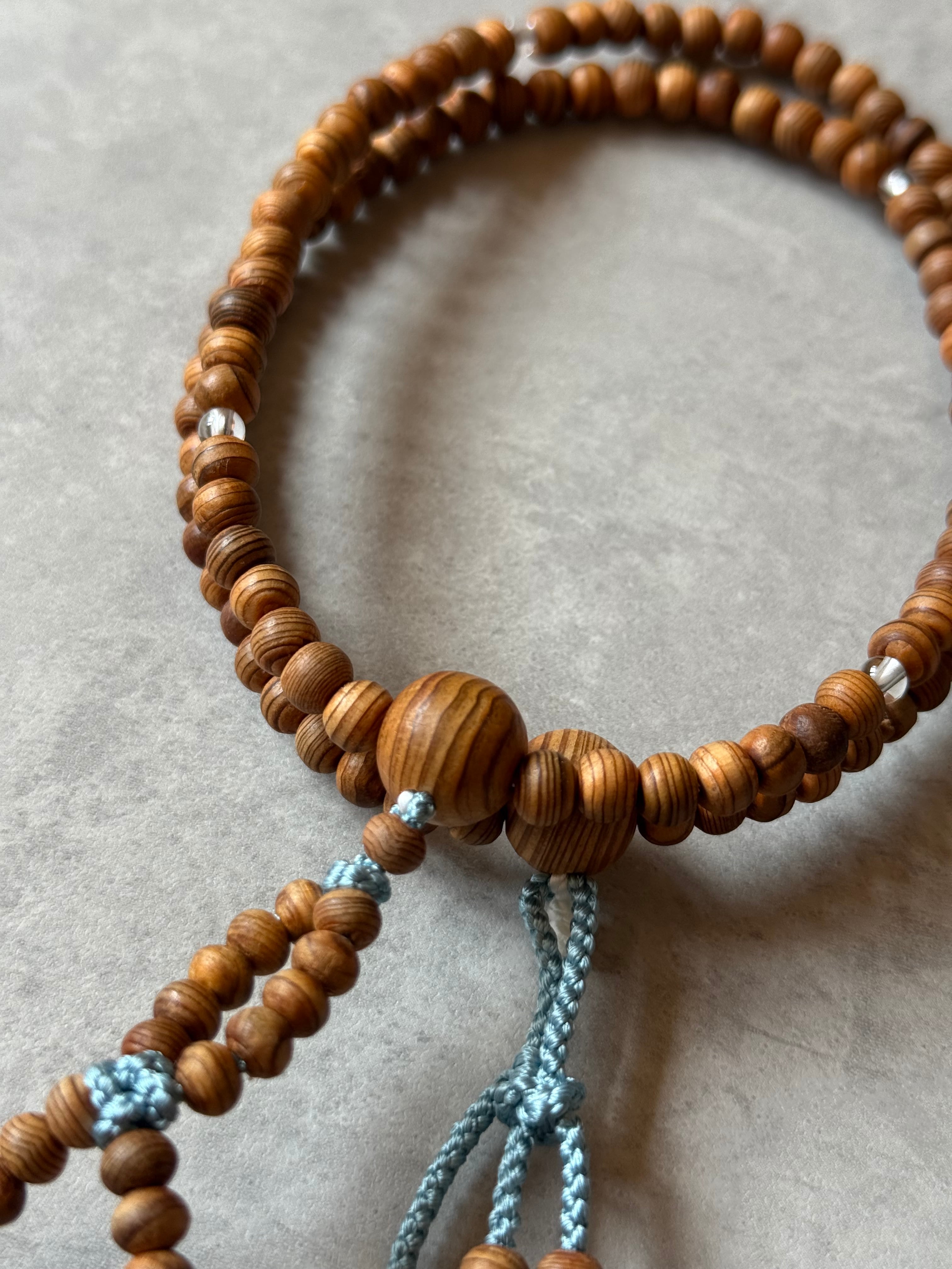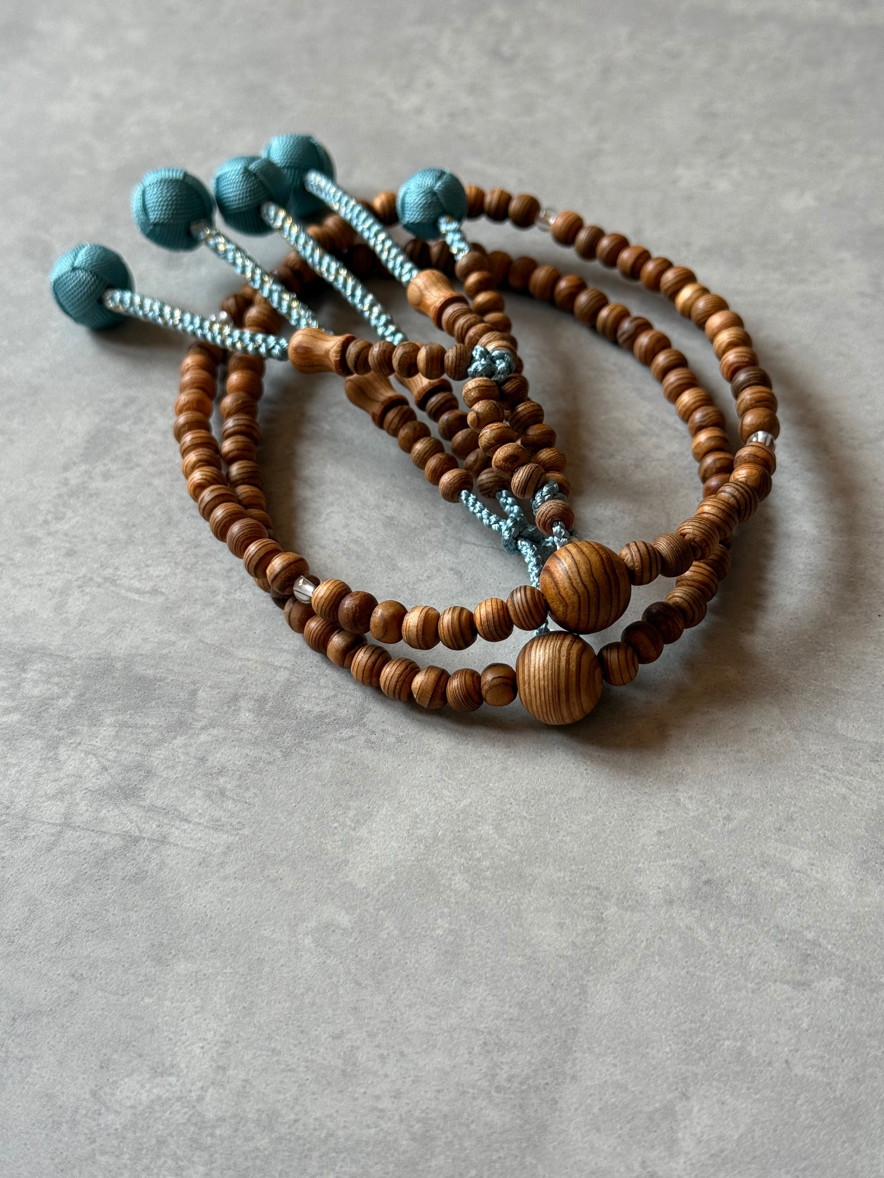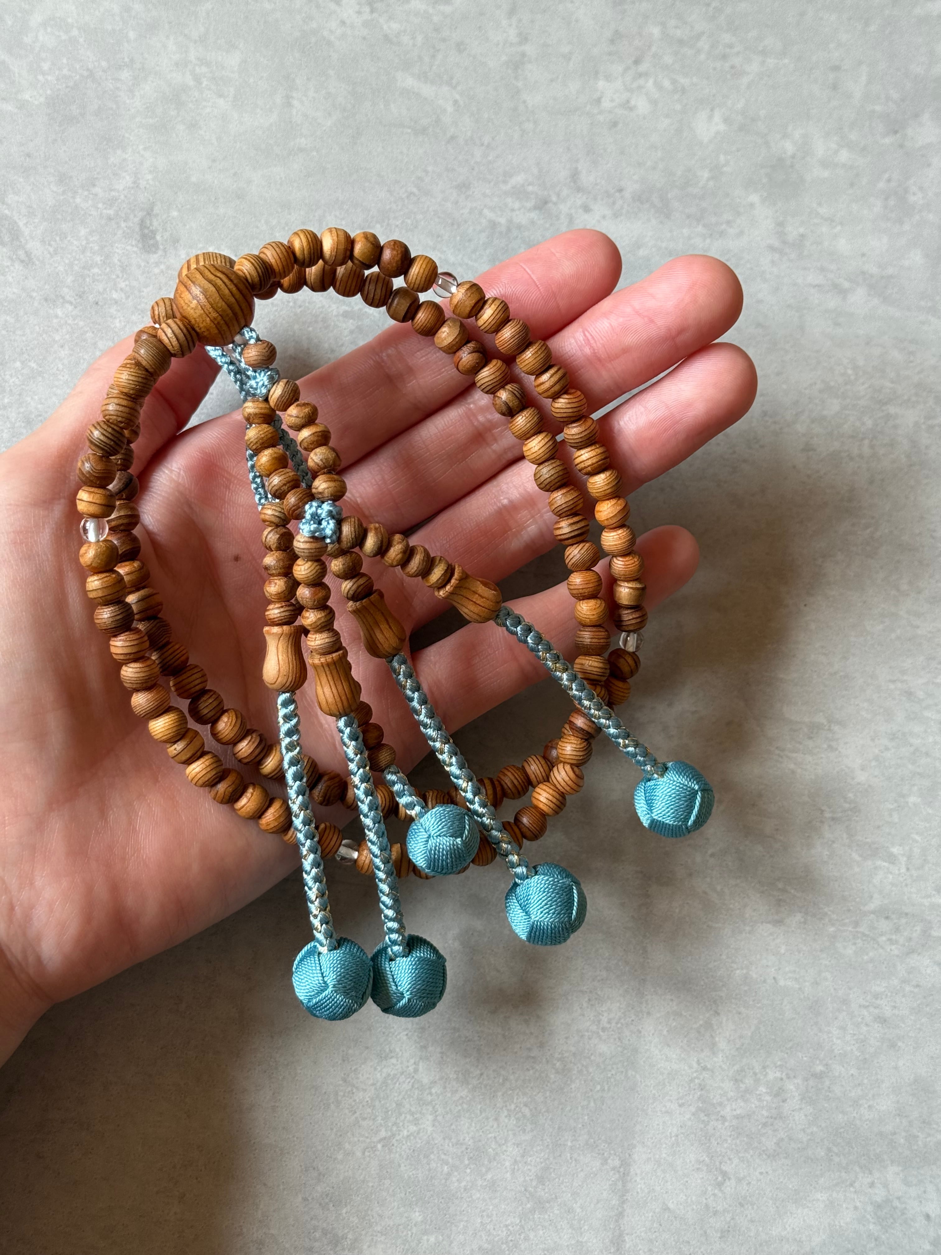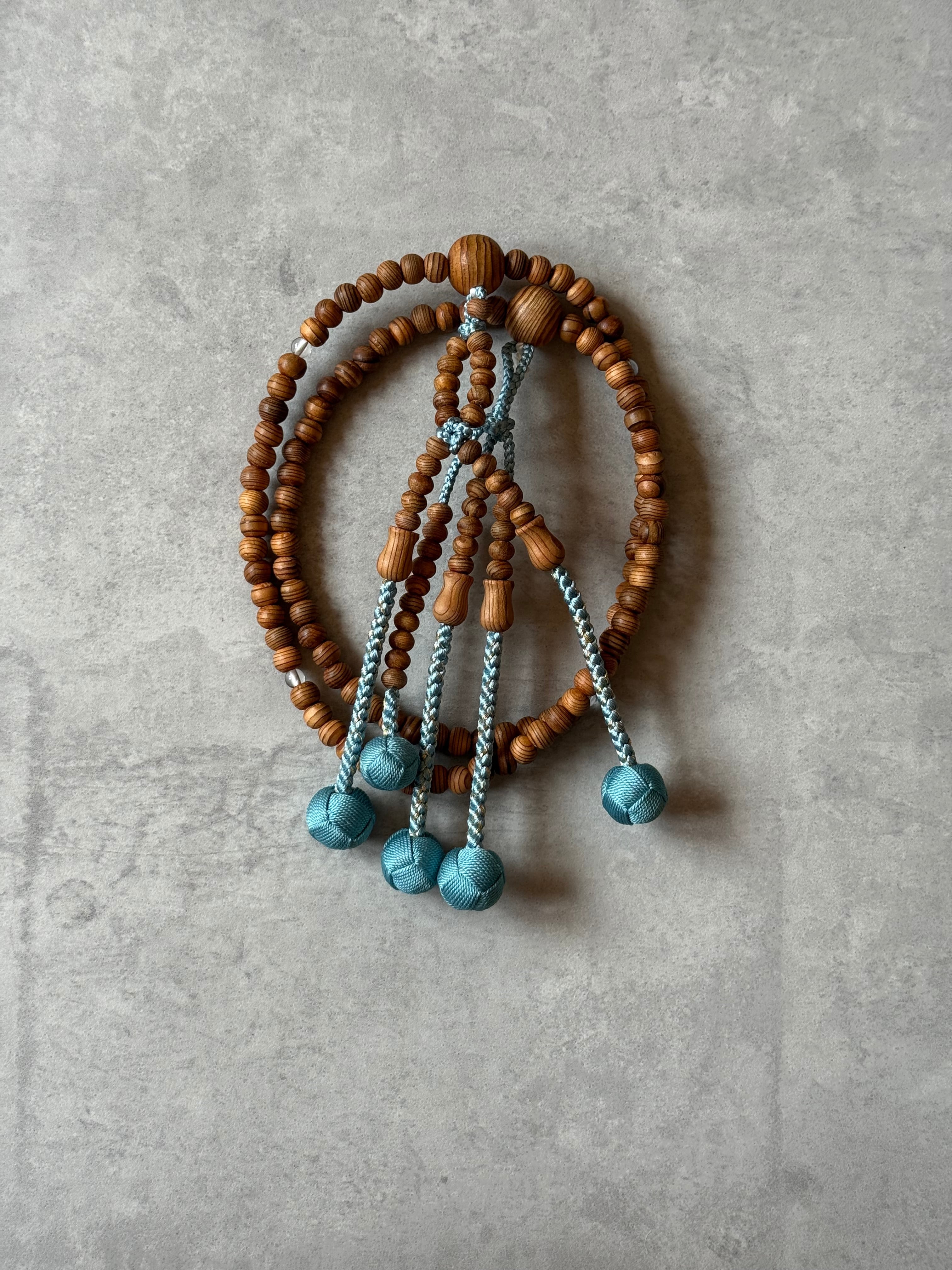 屋久杉に四天のみ水晶で仕立たため、適度な重さが心地良く感じます。浅葱色に金糸を織り込み、華やかな雰囲気に。