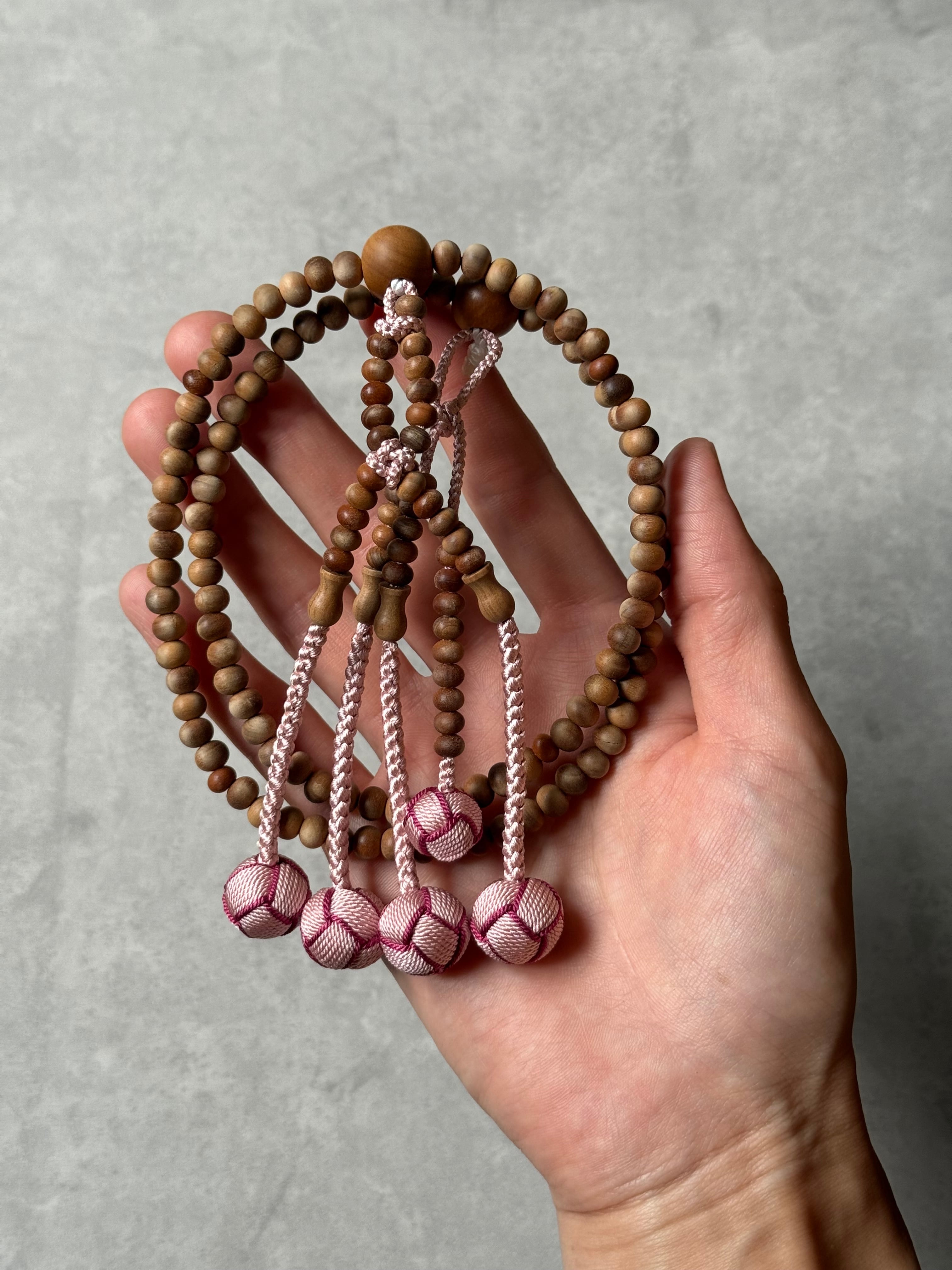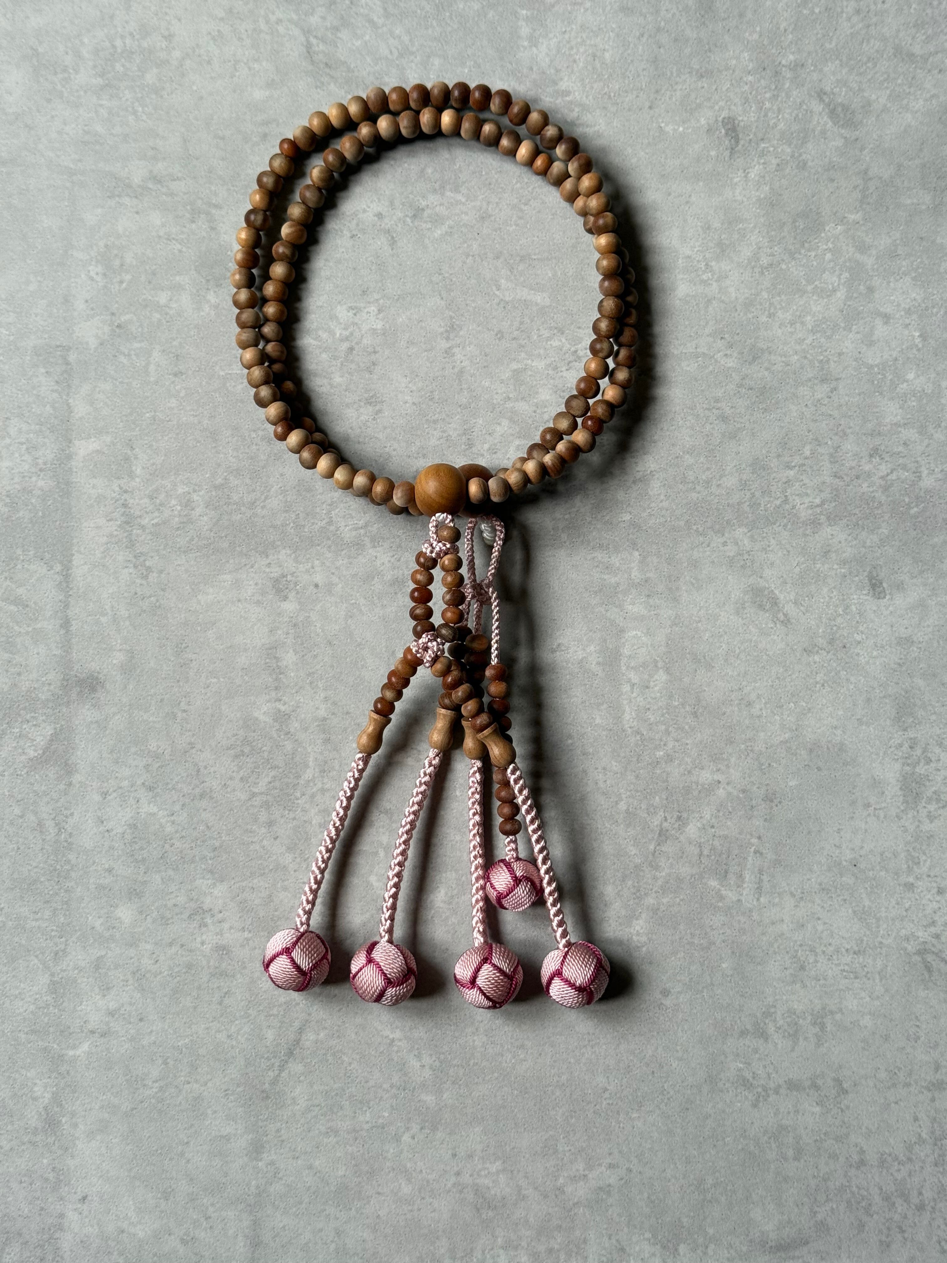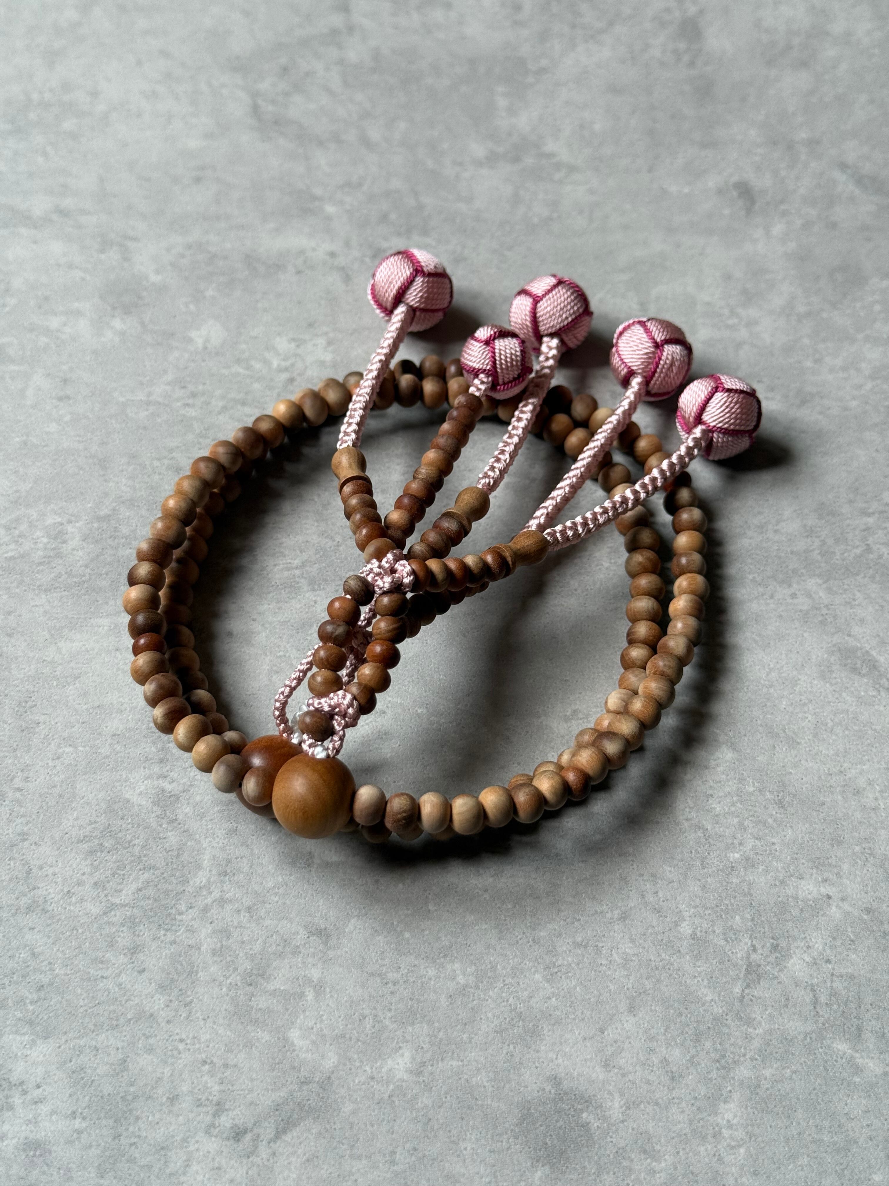 白檀の日蓮宗、女性用のお珠数です。 安定した品質のインドネシア産白檀を使用しております。また、白檀の木から自然と染みてくるオイルでねっとりとした感触があります。こっくりとした濃い色合いの珠もございます。 使い込むと艶が出てきて、色も濃くなっていくのも天然木ならでは。ほんのりと香る白檀の芳醇な香りが心を落ち着かせてくれます。 格式高い白檀ですが、房にはほんの少しの遊び心を。 8寸女性向けのお数珠でございます。 こちらの商品は桐箱に入れてのお届けいたします。
