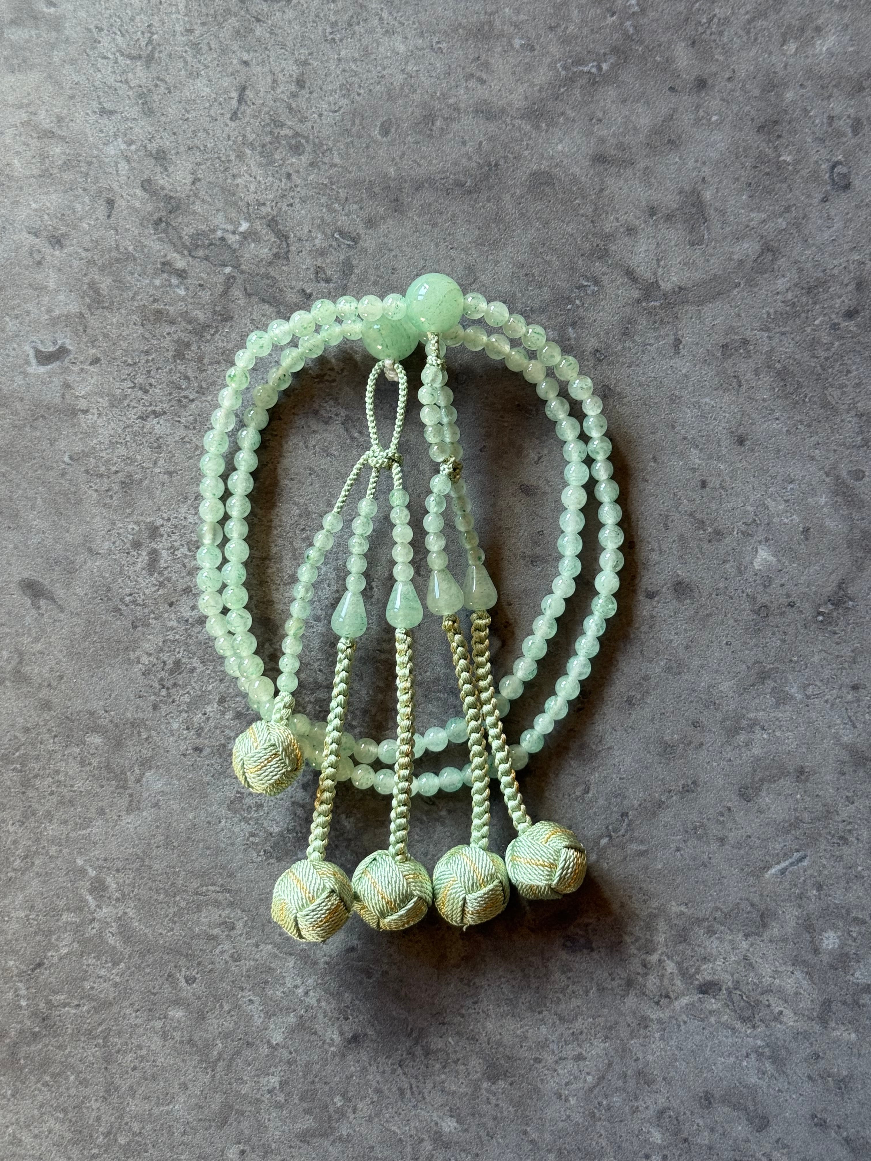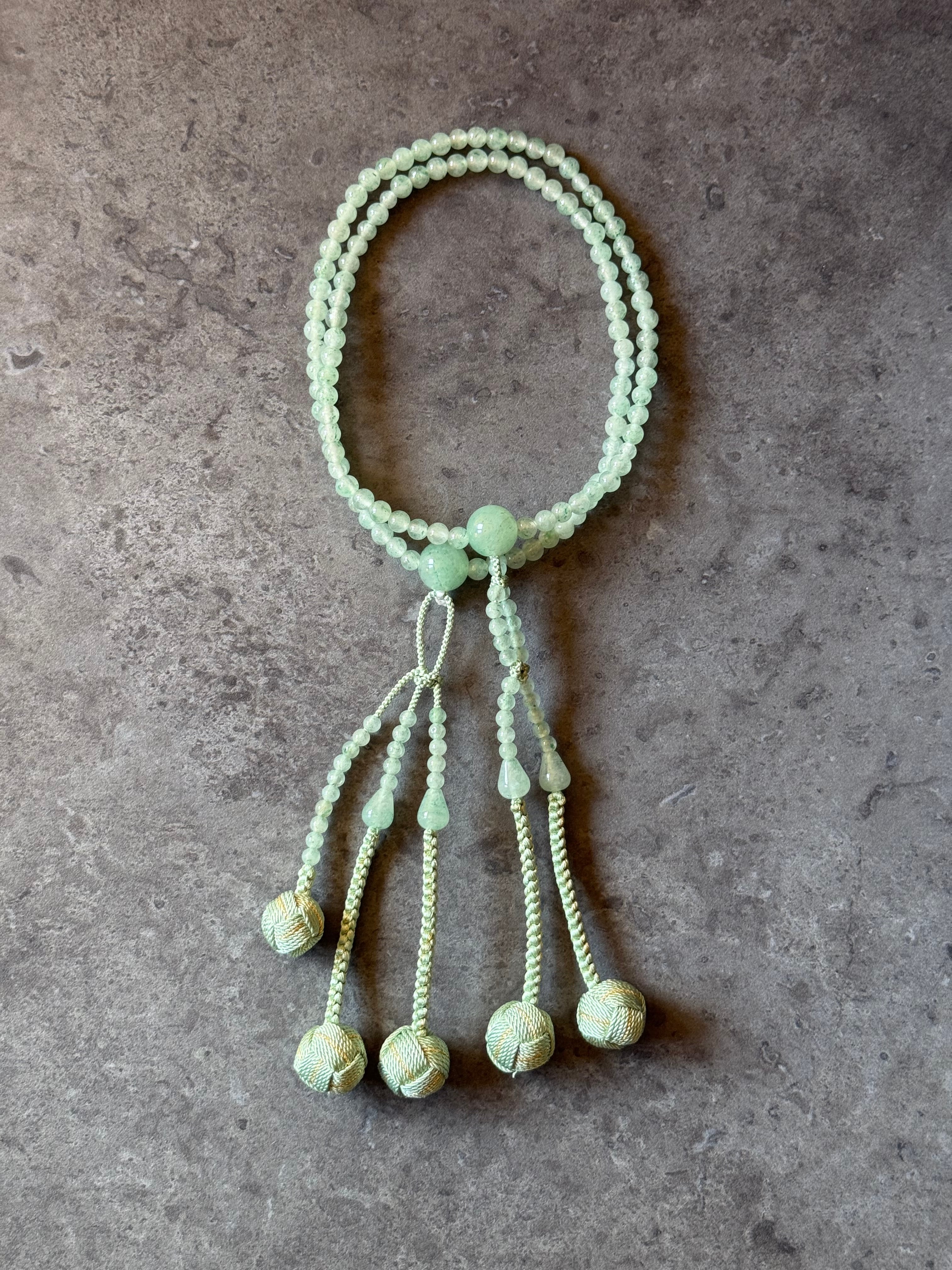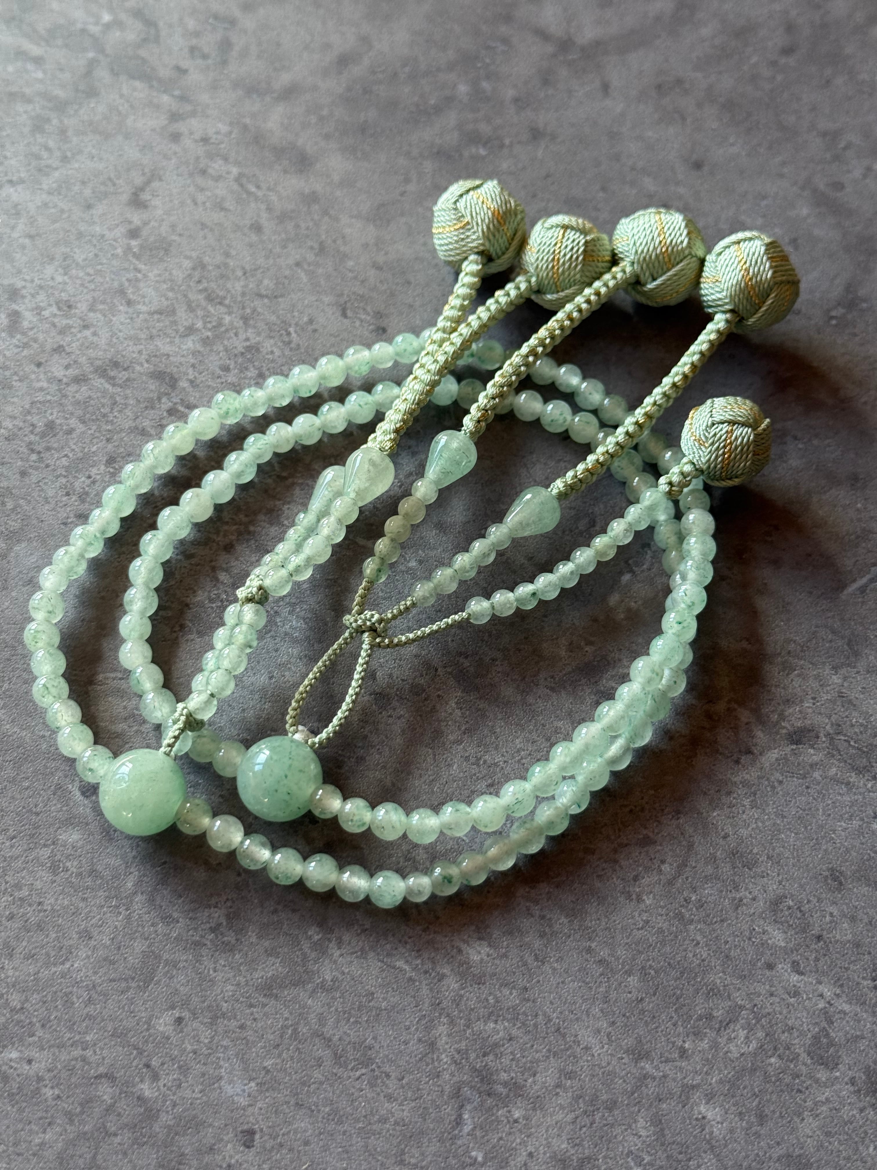 インド翡翠(アベンチュリン)は緑色となった石英のことです。産地がインドで翡翠のように美しい緑色をしていることから「インド翡翠」と呼ばれています。 この石には、疲れた心を癒したりストレスを解消したりする力があるといわれております。 薄づきですが、透き通るグリーンが美しいアベンチュリンに、上質な正絹の薄柳に金糸を織り交ぜ上品に。 8寸女性(小学生くらいのお子様も可)向けのお数珠でございます。 こちらは桐箱へ入れてお届けいたします。