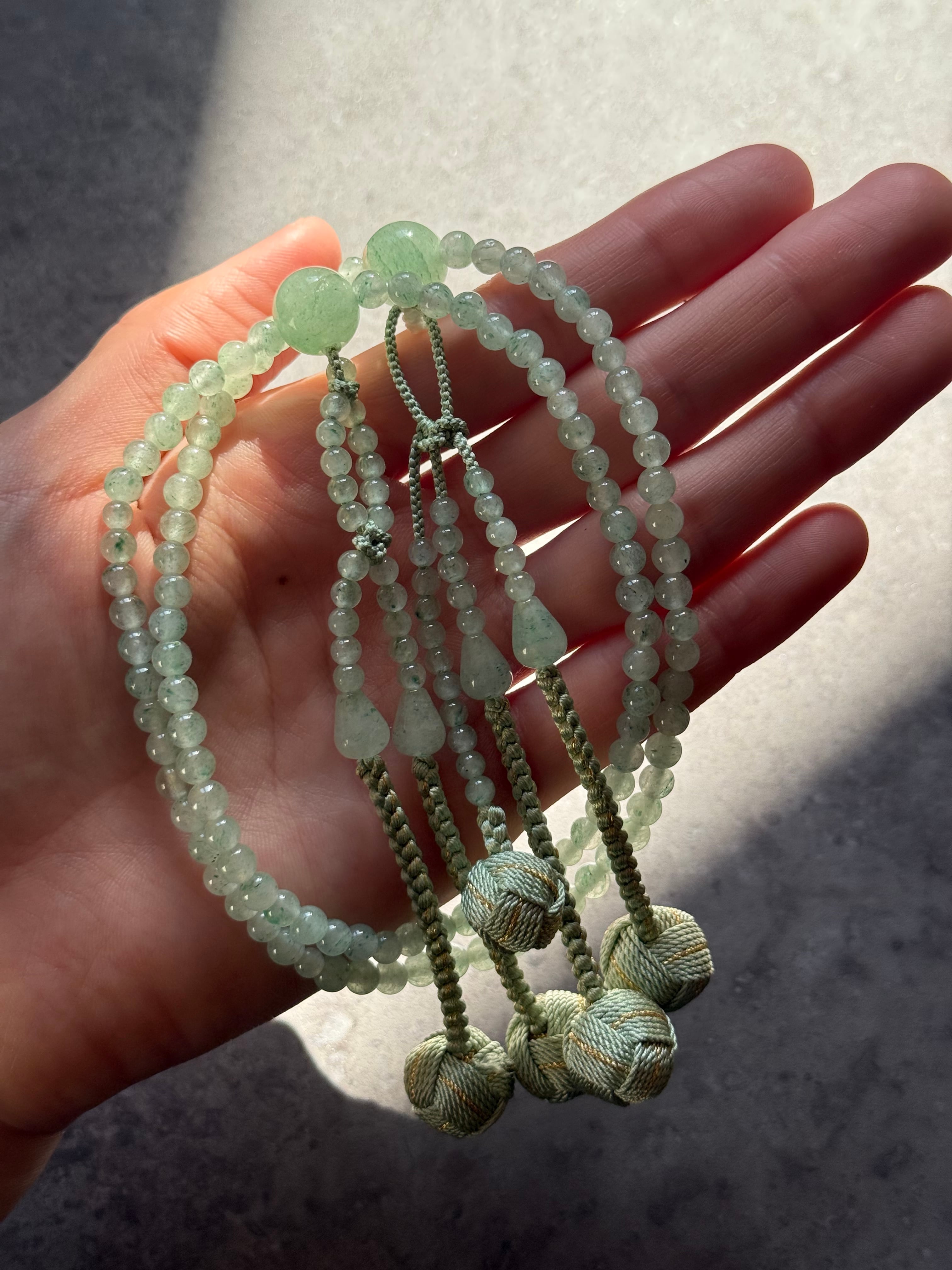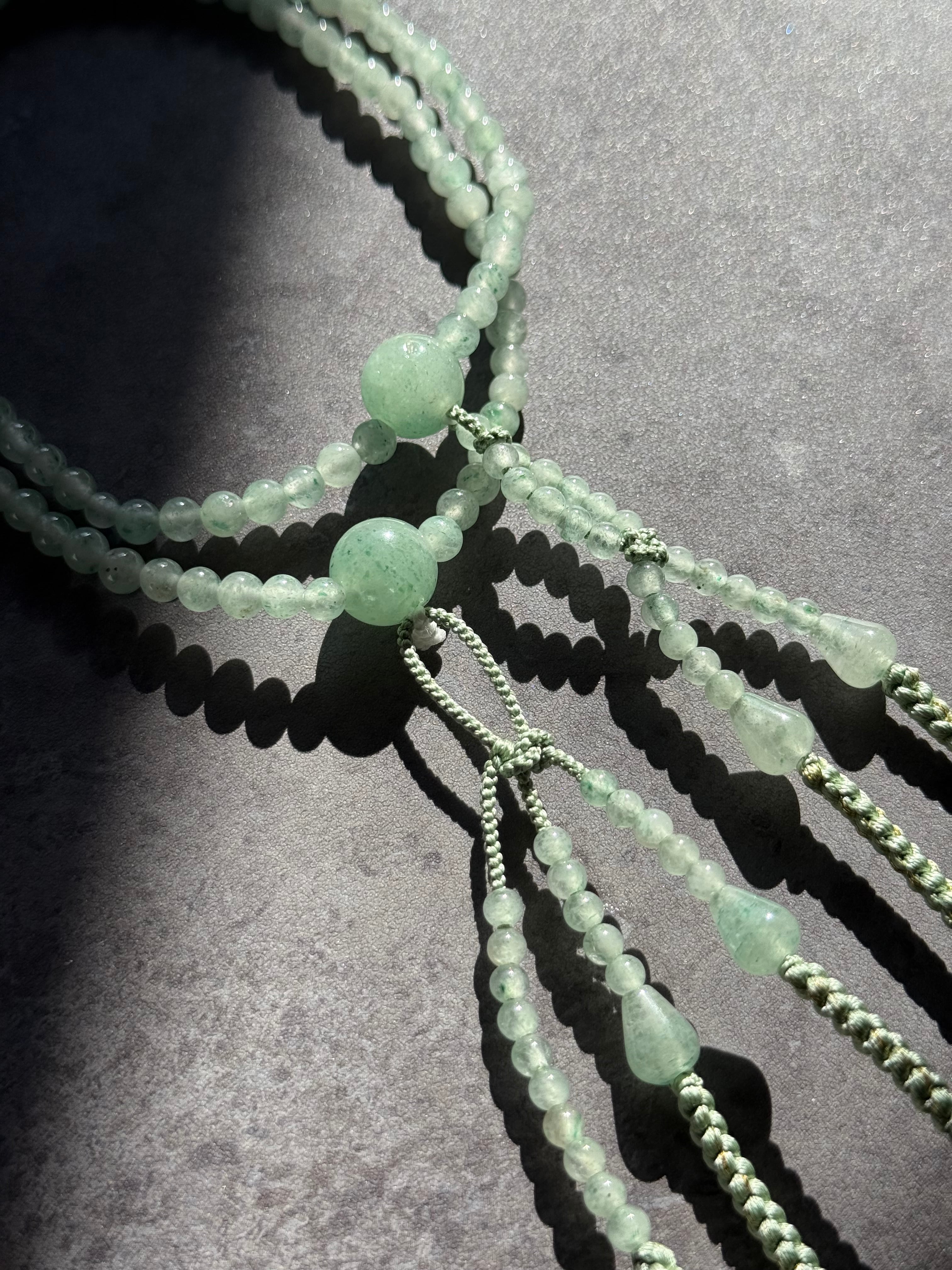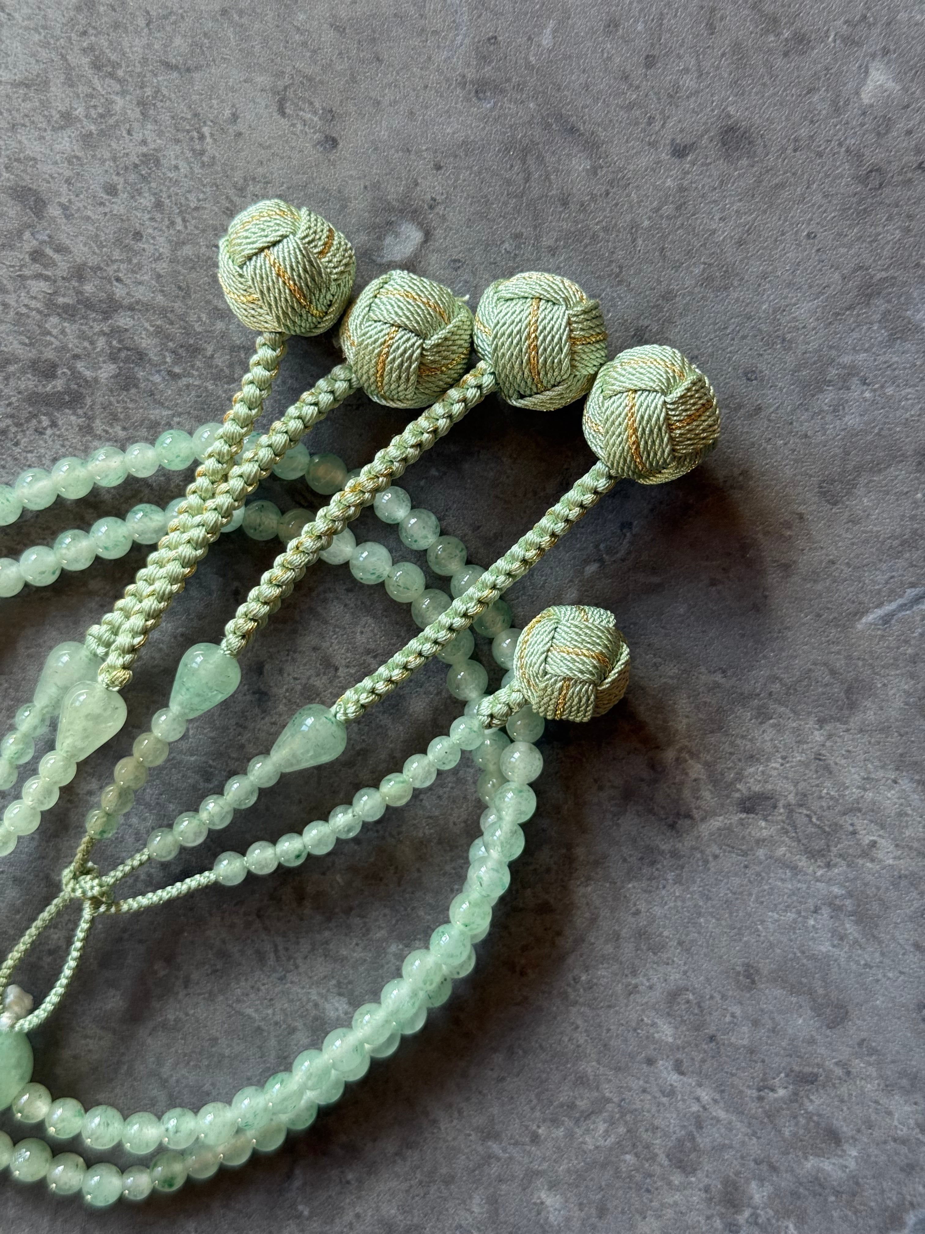 インド翡翠(アベンチュリン)は緑色となった石英のことです。産地がインドで翡翠のように美しい緑色をしていることから「インド翡翠」と呼ばれています。 この石には、疲れた心を癒したりストレスを解消したりする力があるといわれております。 薄づきですが、透き通るグリーンが美しいアベンチュリンに、上質な正絹の薄柳に金糸を織り交ぜ上品に。 8寸女性(小学生くらいのお子様も可)向けのお数珠でございます。 こちらは桐箱へ入れてお届けいたします。