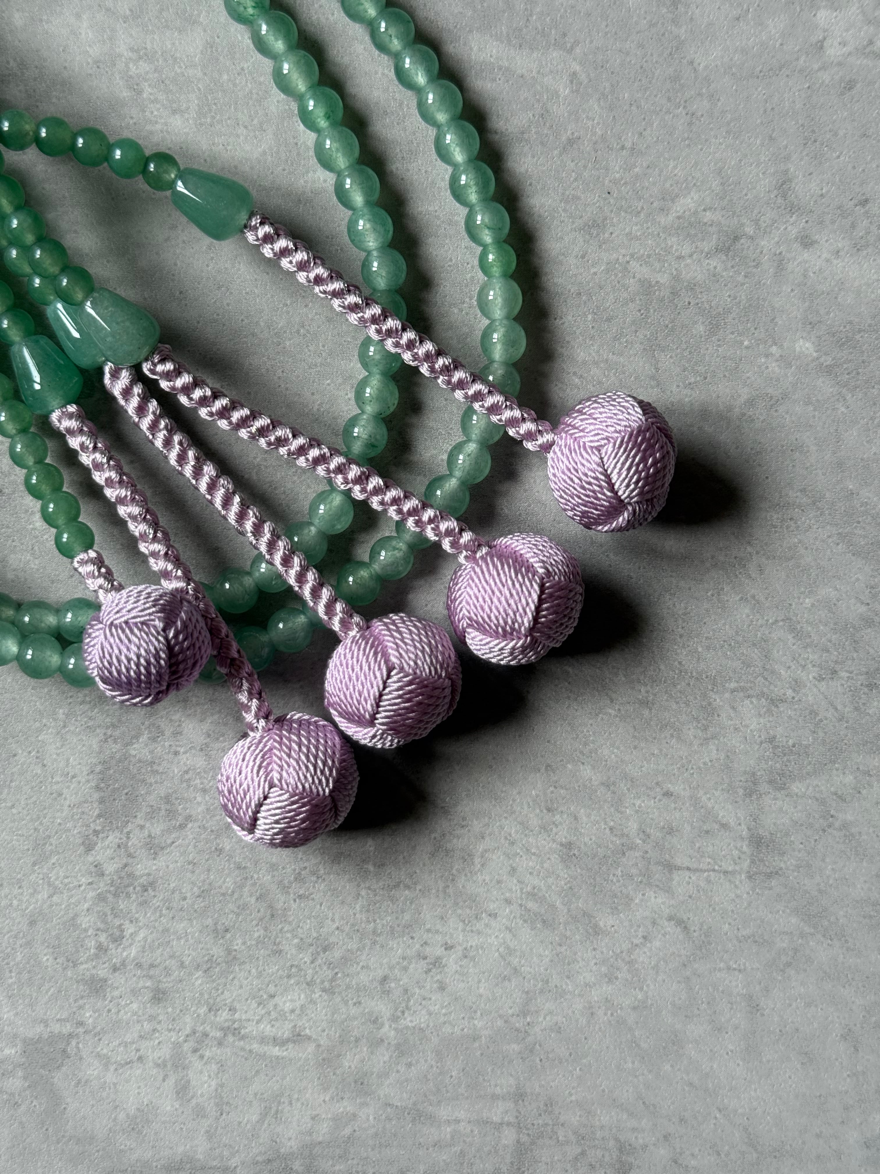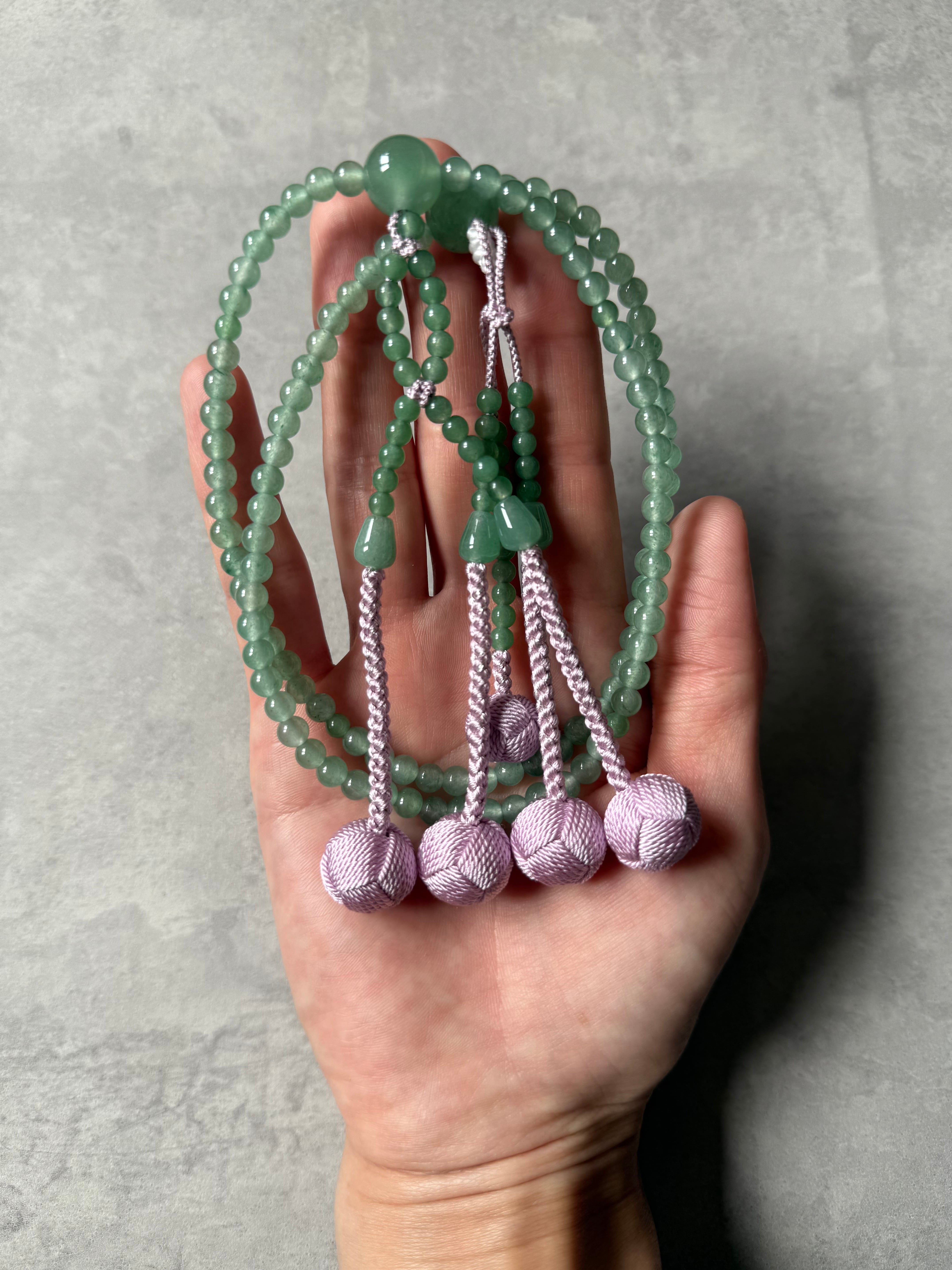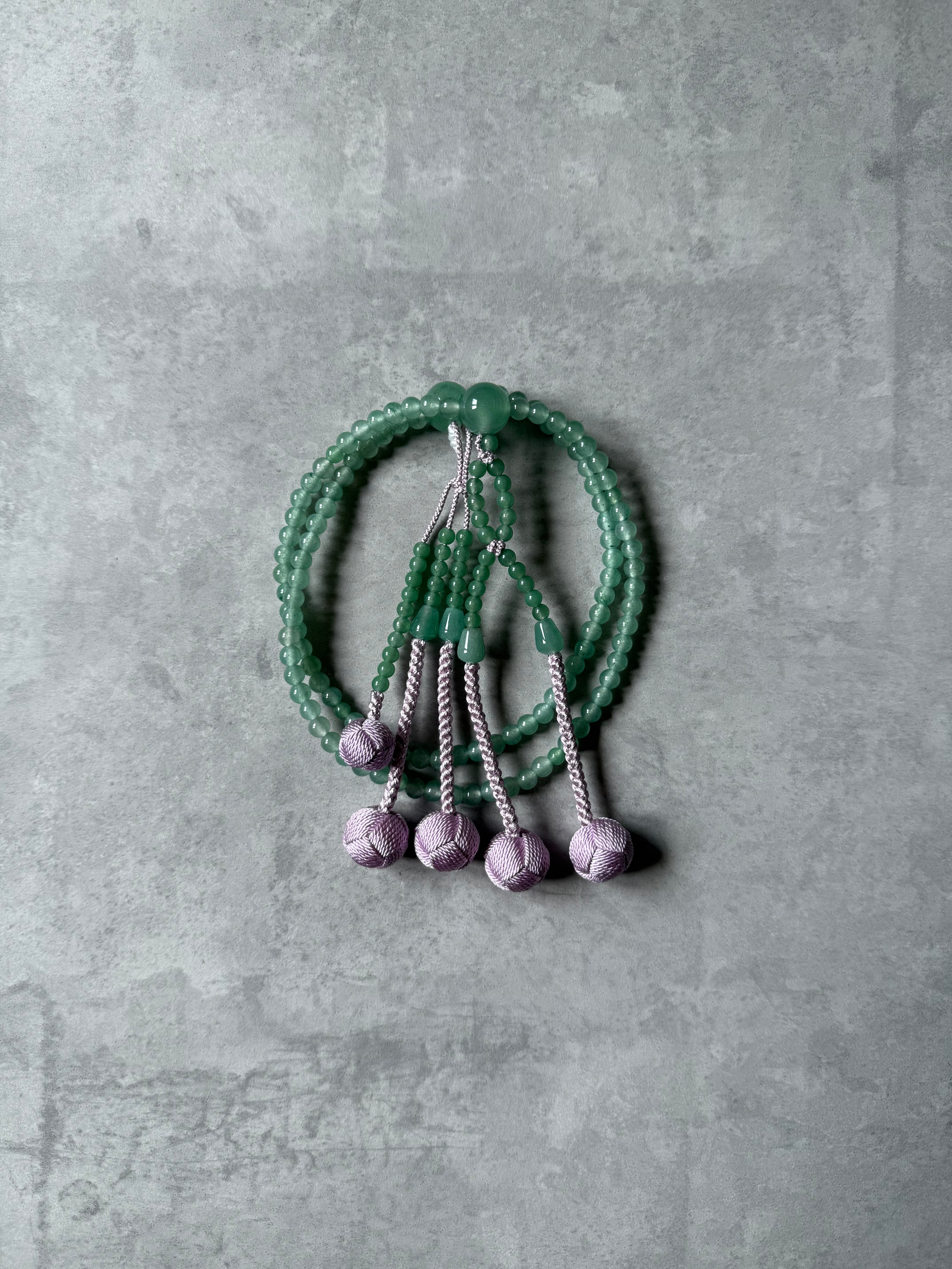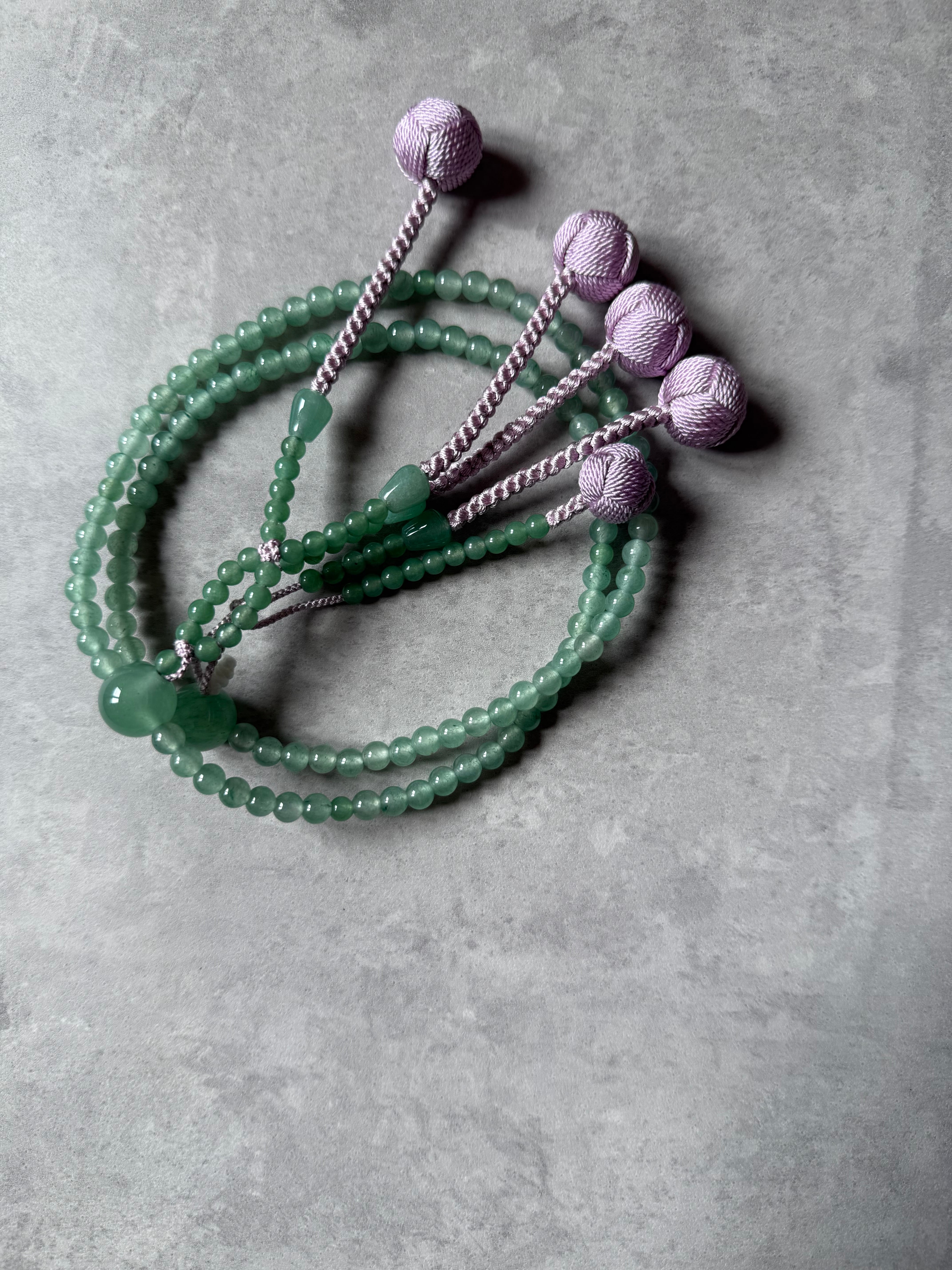 インド翡翠(アベンチュリン)は緑色となった石英のことです。産地がインドで翡翠のように美しい緑色をしていることから「インド翡翠」と呼ばれています。 この石には、疲れた心を癒したりストレスを解消したりする力があるといわれております。 とろみのあるアベンチュリンに銀糸を織り交ぜた藤色は奥ゆかしく華やかな印象に。 8寸女性(小学生くらいのお子様も可)向けのお数珠でございます。 こちらは桐箱へ入れてお届けいたします。