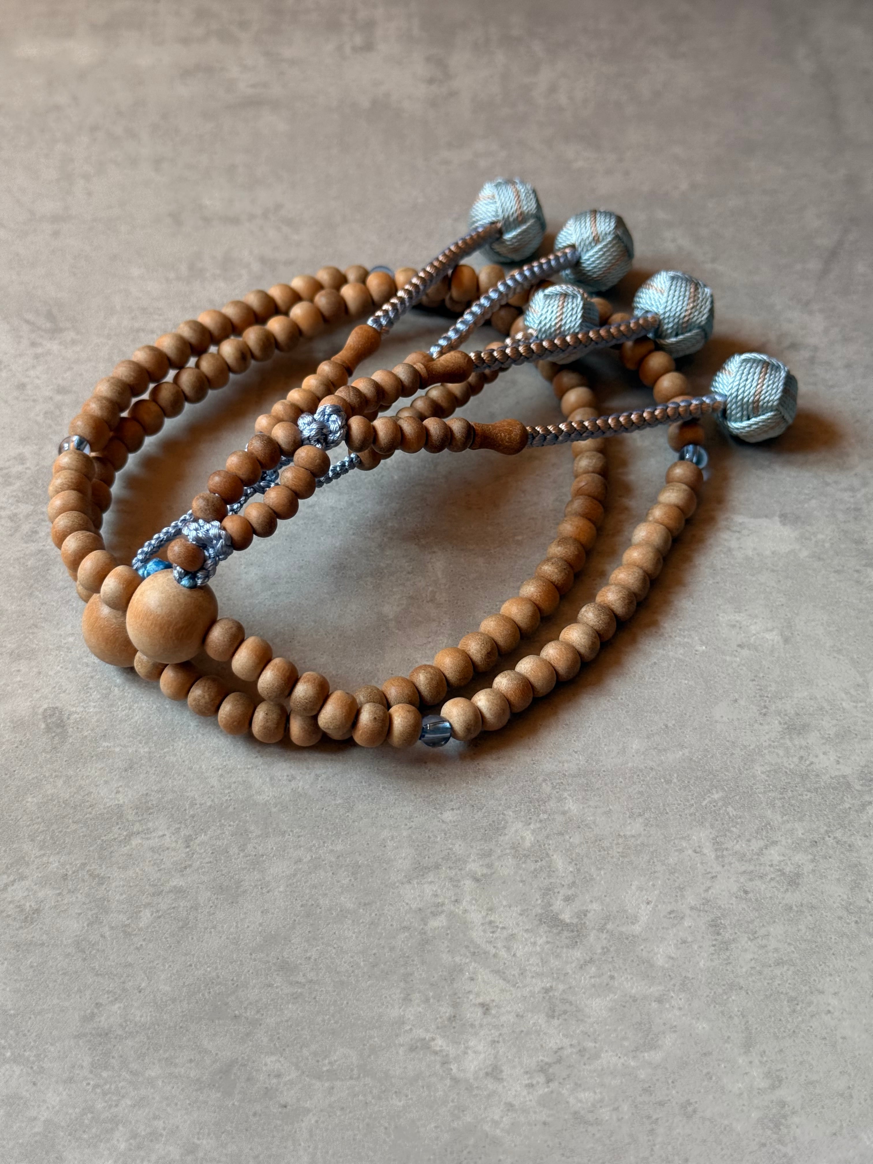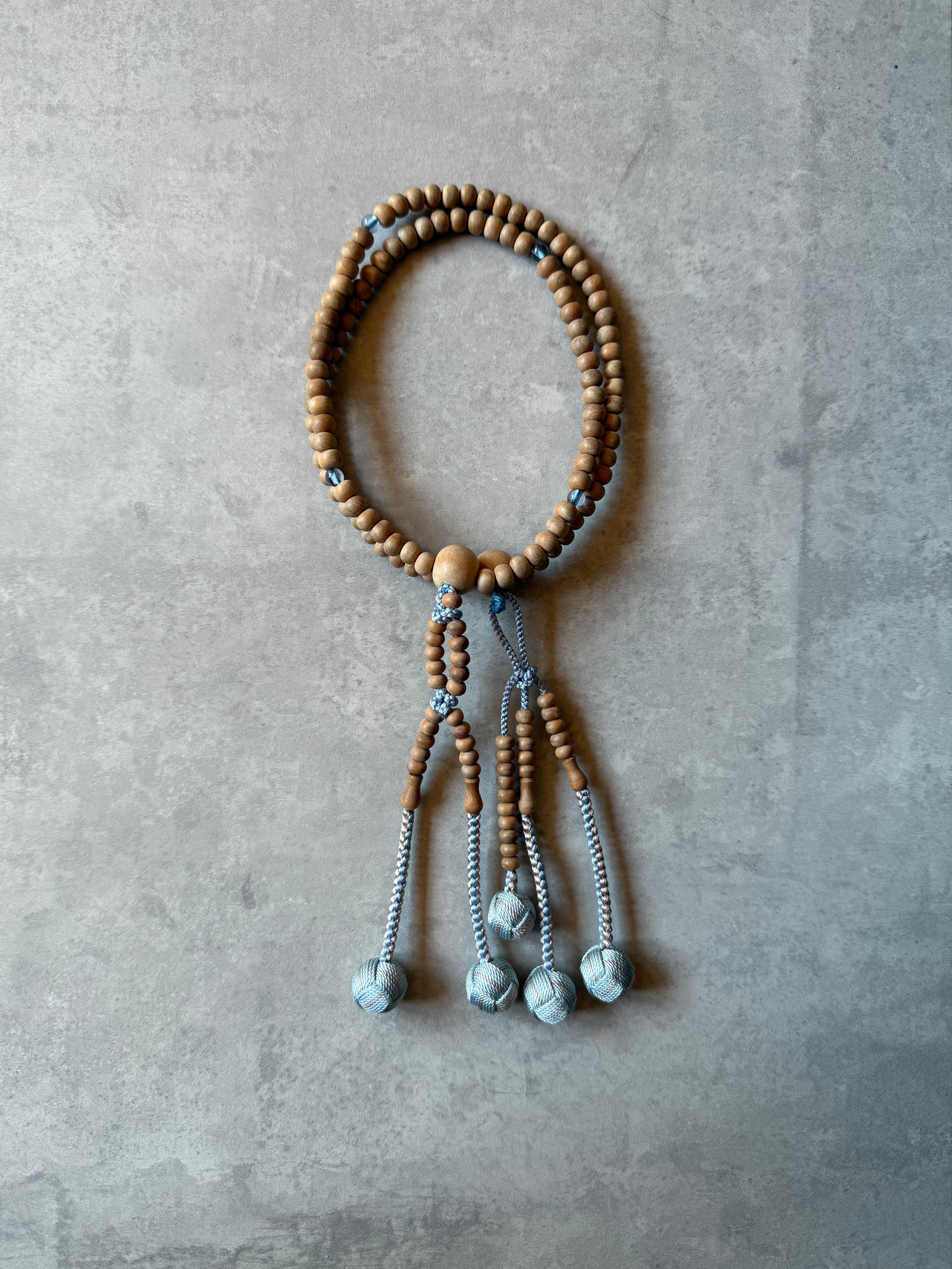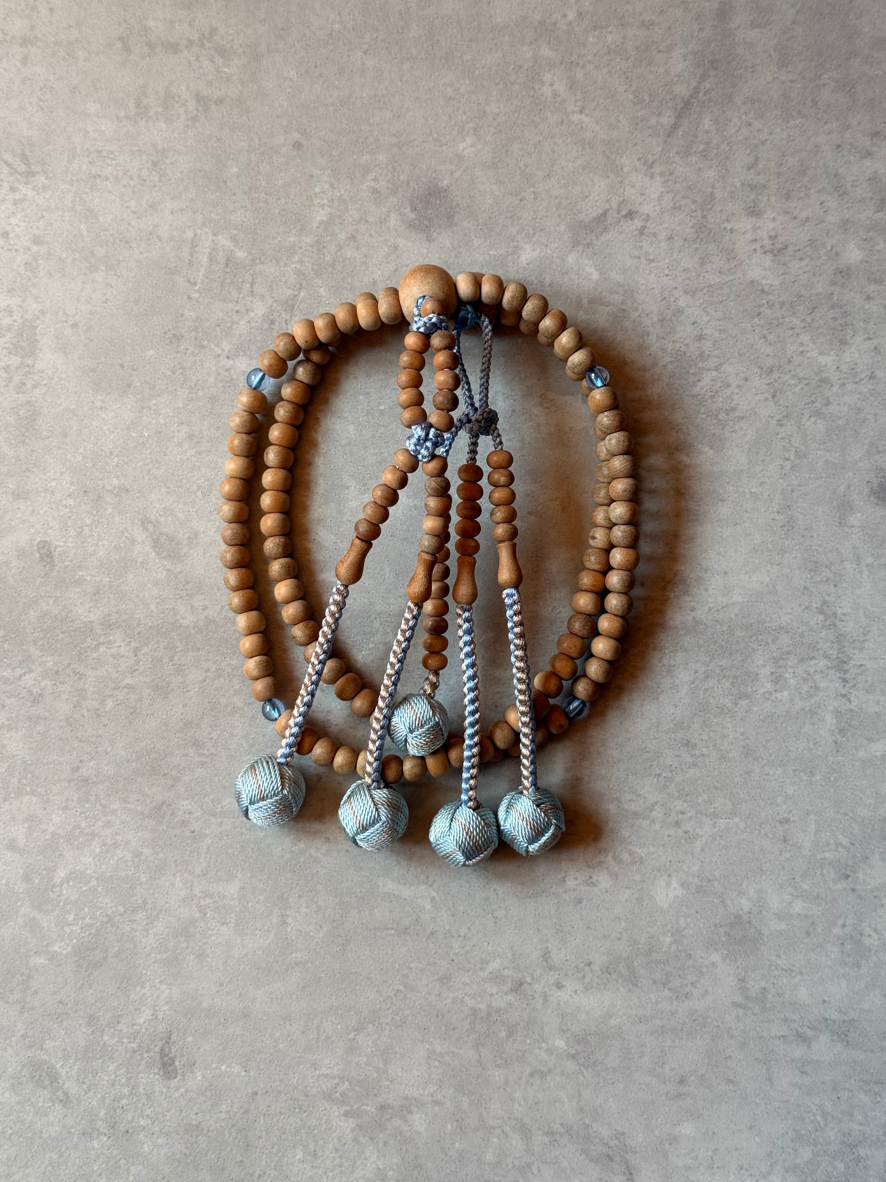 すっきりとしたブルークォーツを四天に入れることでその柔らかな印象が凛々しく感じる一連となっております。房は軸と梵天のブルーは違う2種類を使用しております。