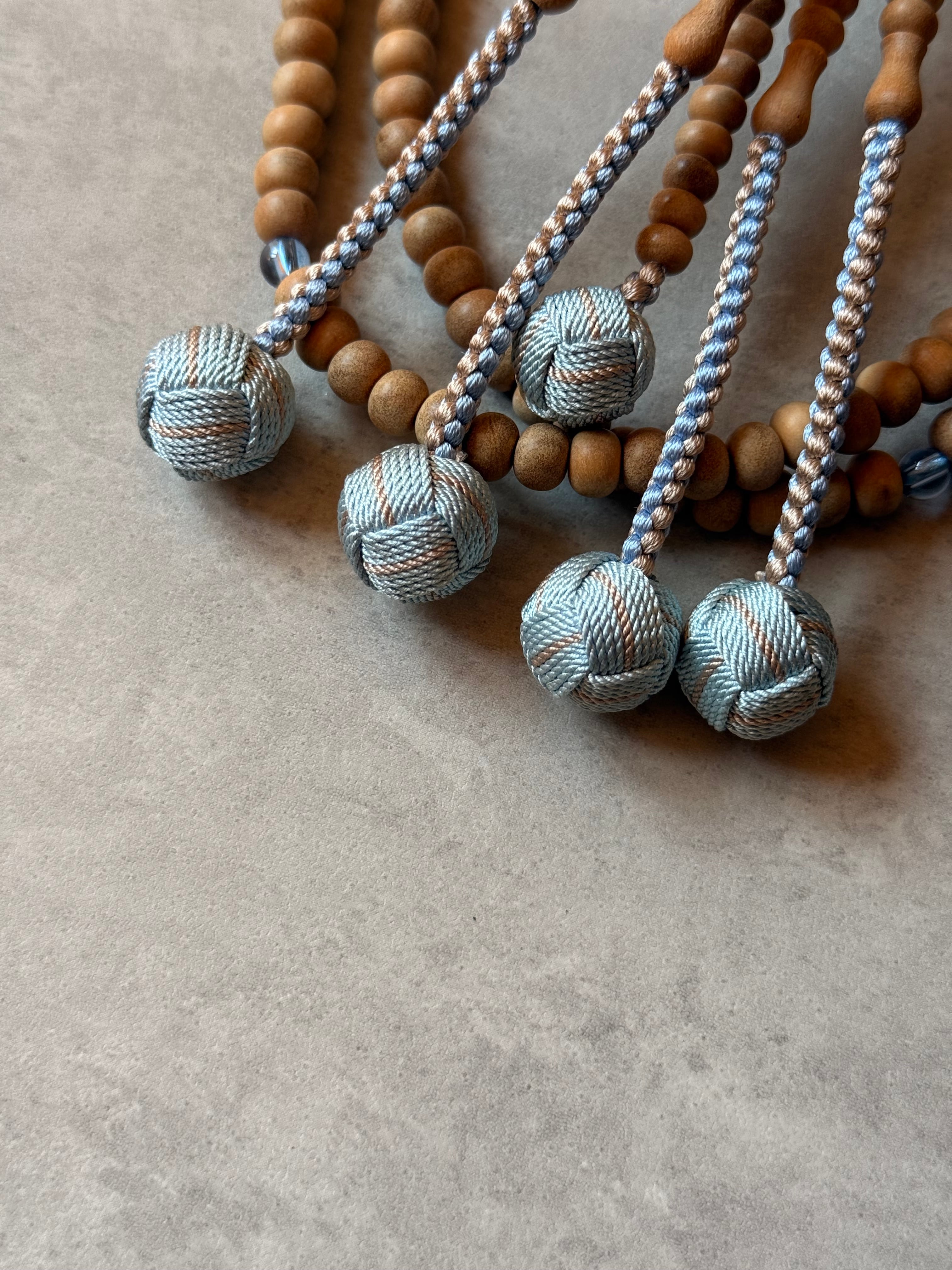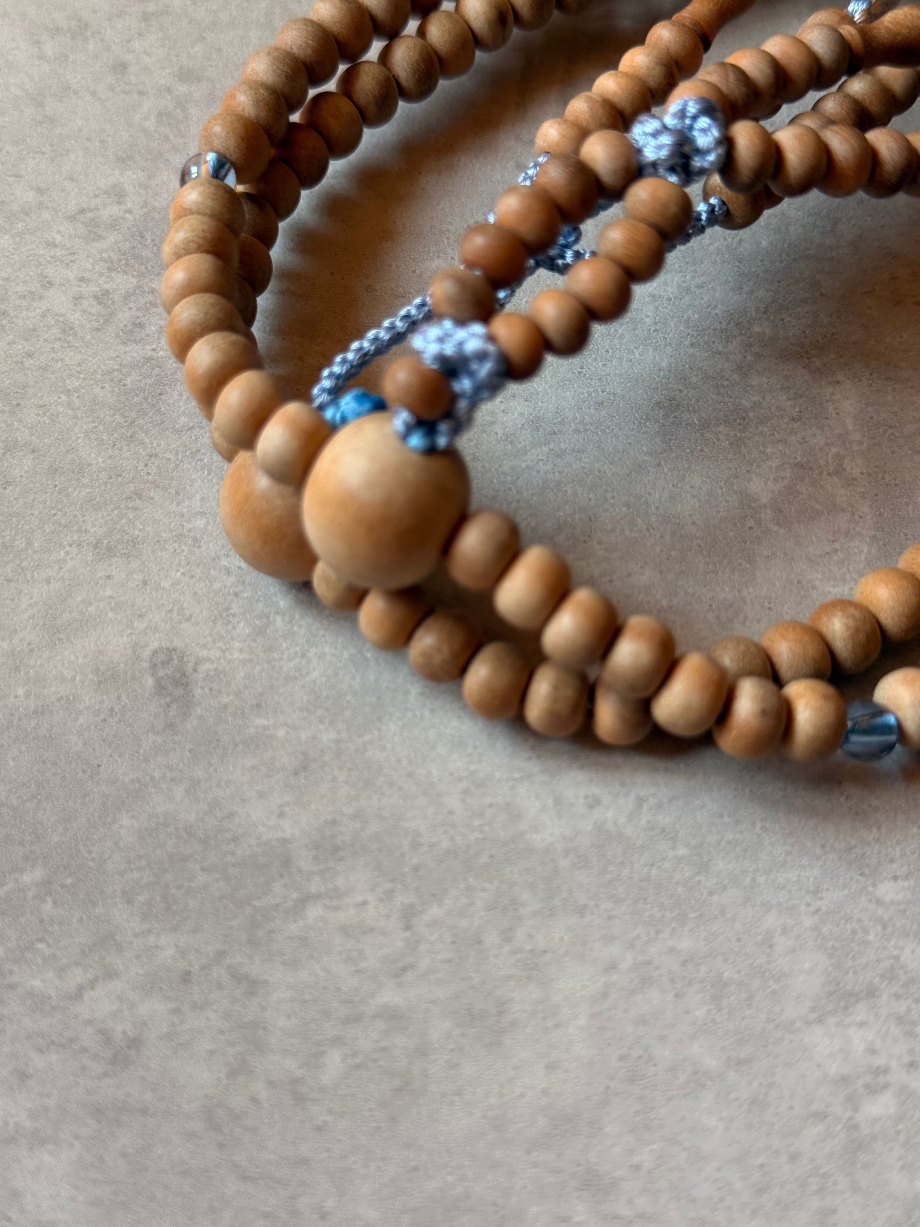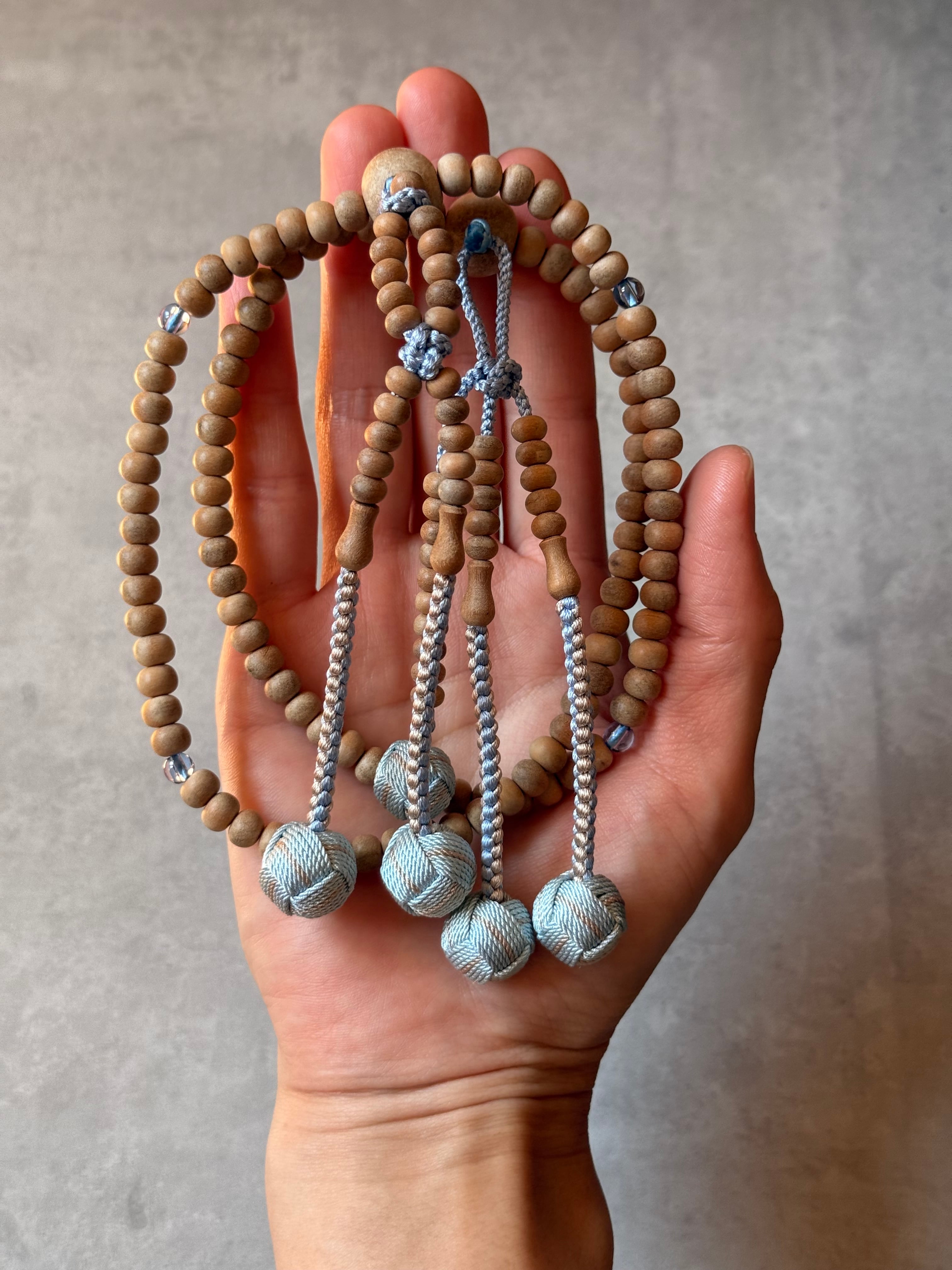 すっきりとしたブルークォーツを四天に入れることでその柔らかな印象が凛々しく感じる一連となっております。房は軸と梵天のブルーは違う2種類を使用しております。