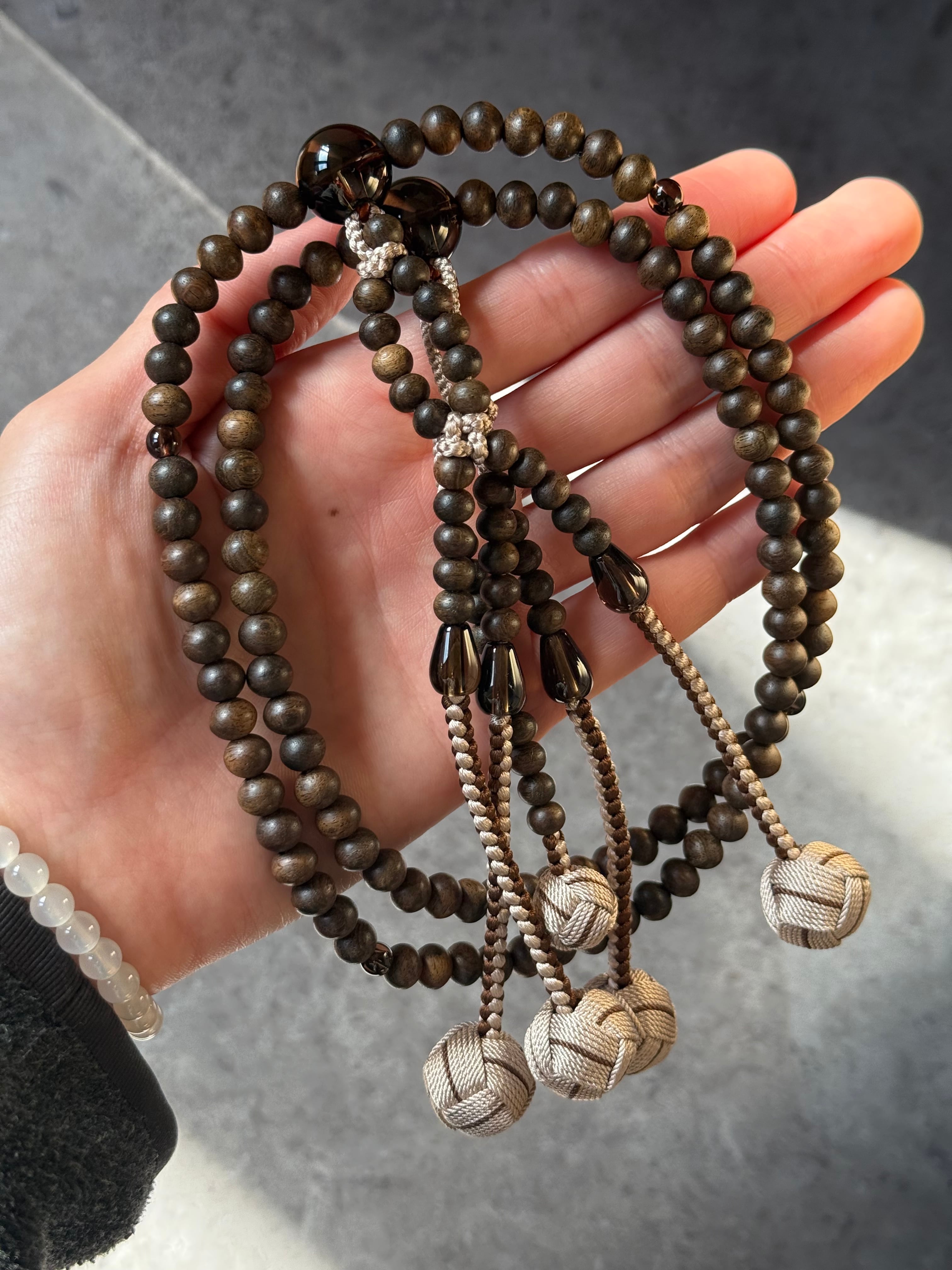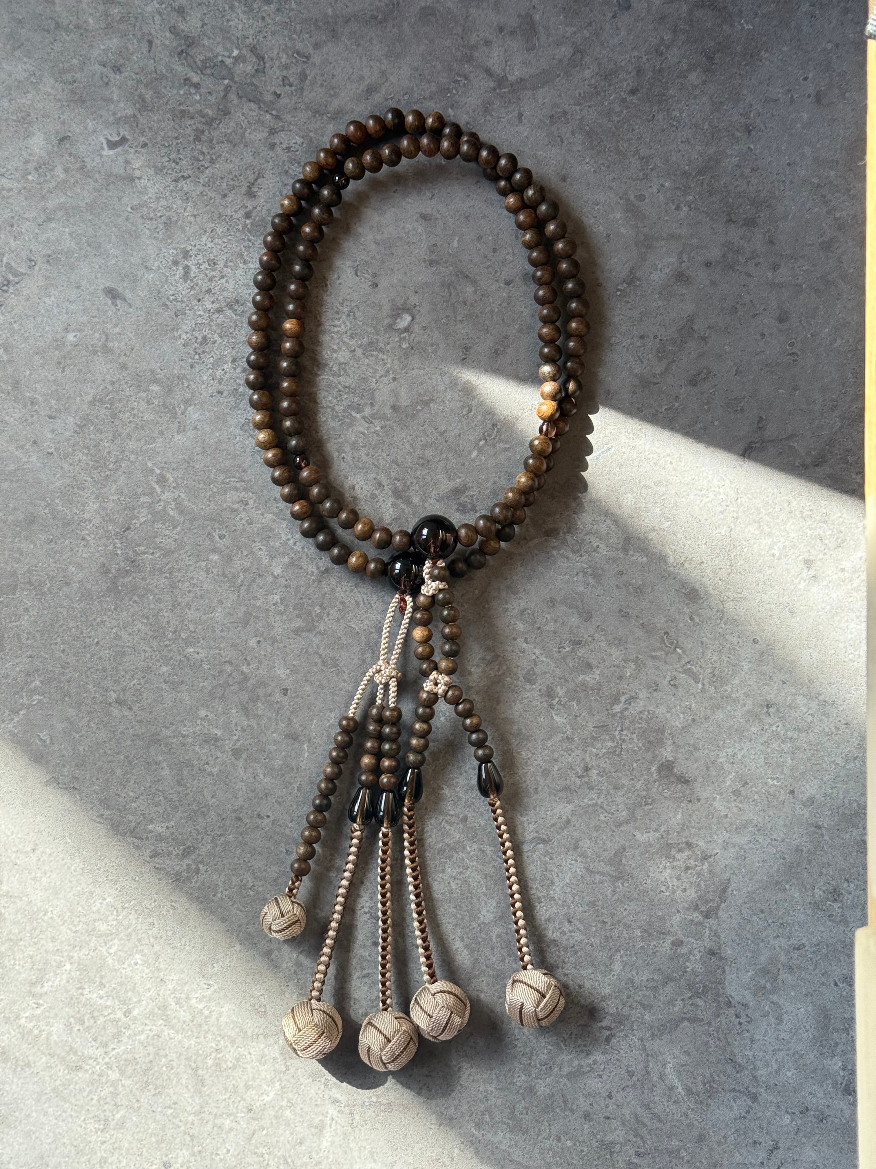 非常に多彩な表情をもち、上品な印象のある銘木に、落ち着きのある茶水晶を合わせ仕立てました。