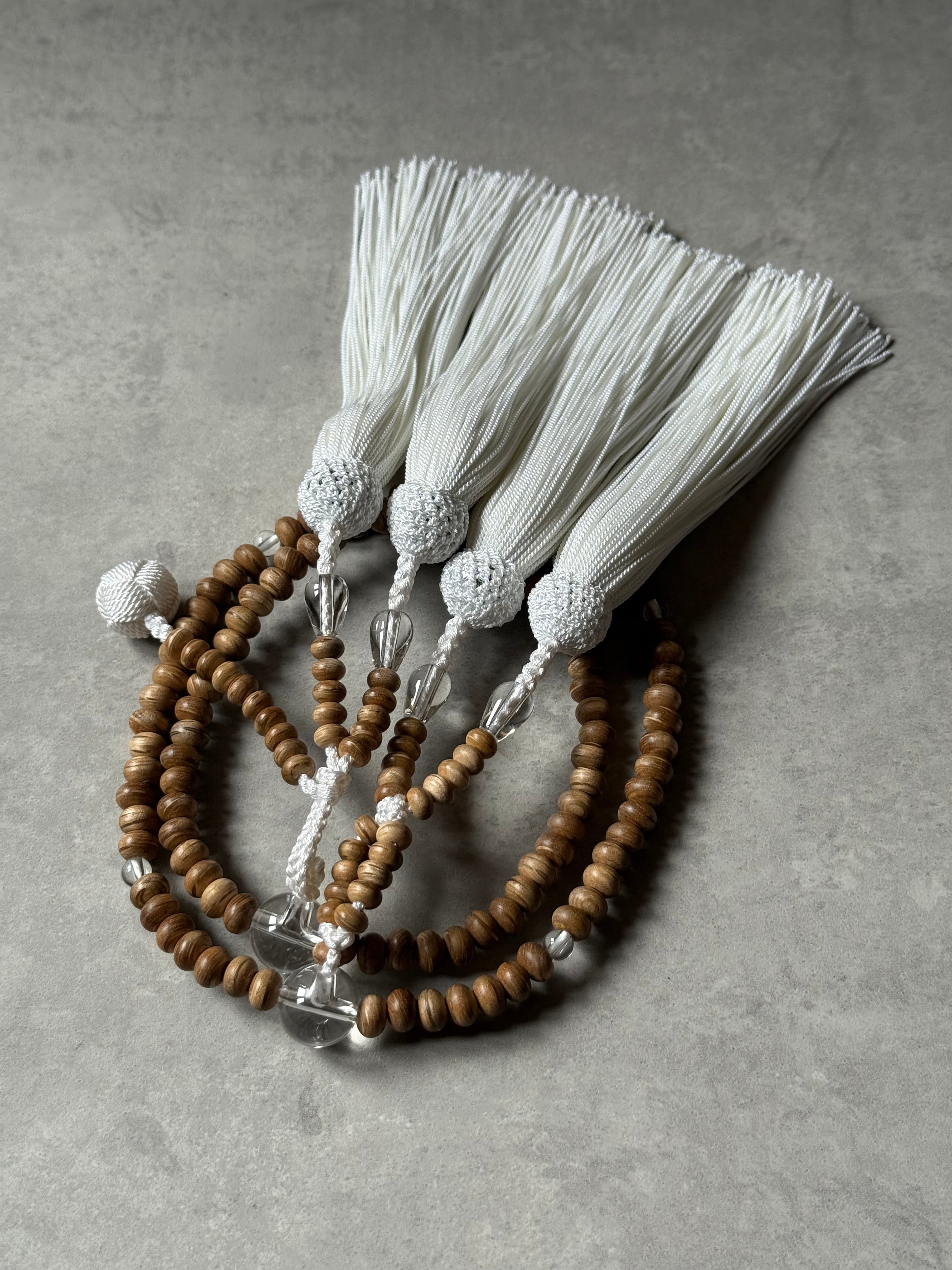 万能の石水晶と合わせて仕立て、房は白ですっきりと。
