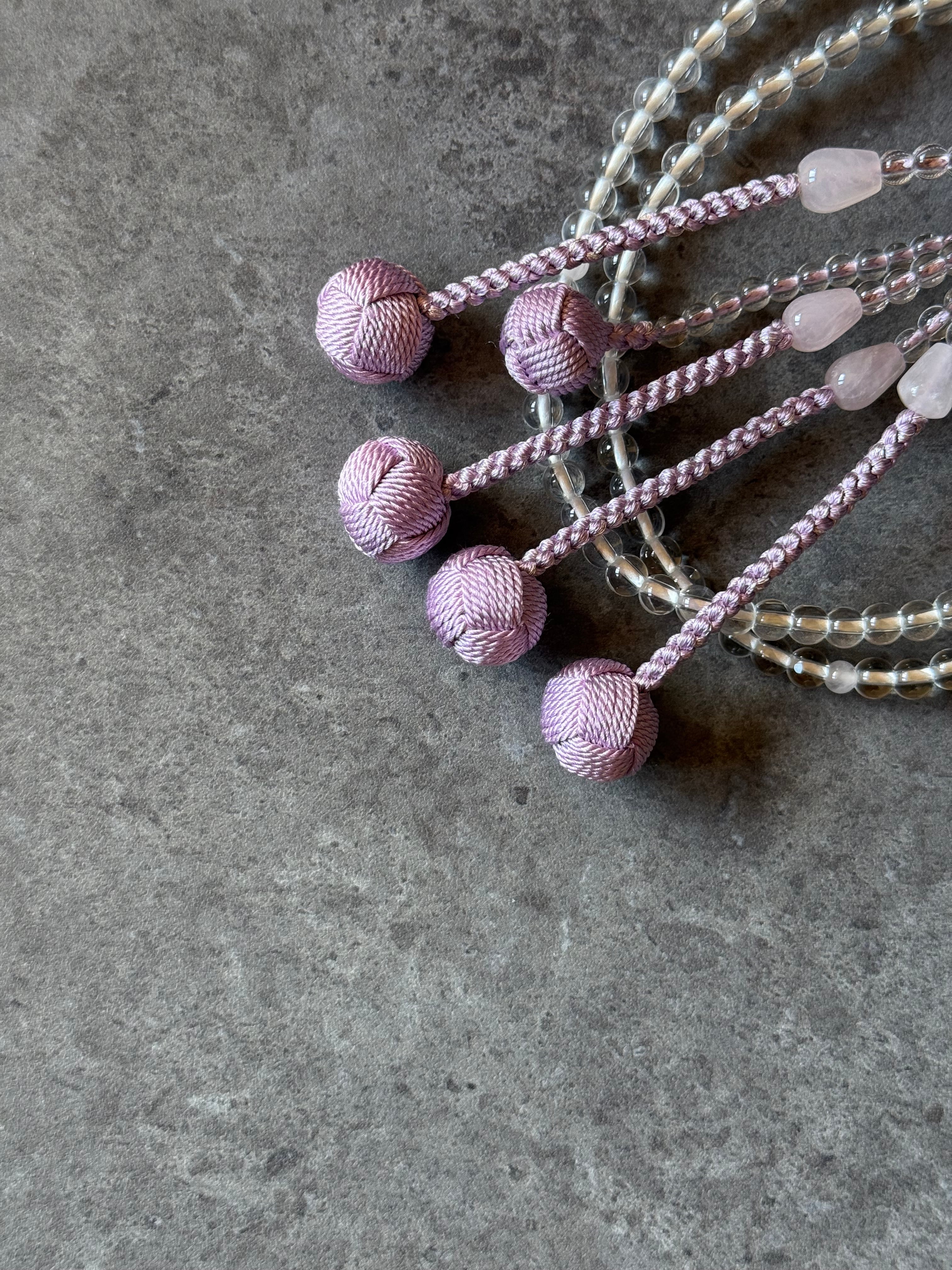 女性と相性のいい紅水晶仕立で、房は藤に銀糸を織り交ぜ華やかな雰囲気に仕立てました。
